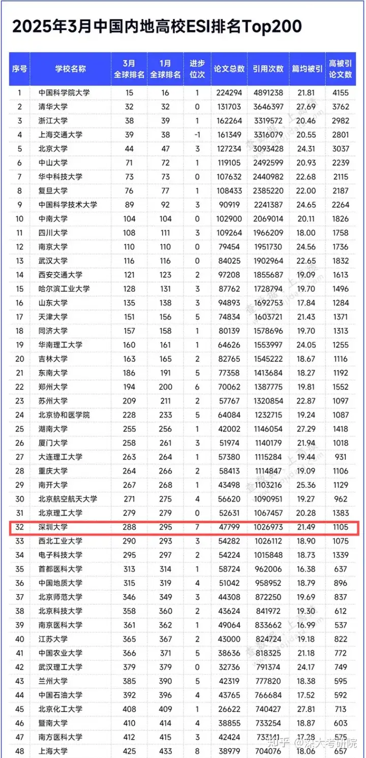 深圳大学2025年3月中国内地高校ESI排名进步7个名次,3月全国排名第32名。  在2025年3月中国内地高校ESI广东省高校排名中,深圳大学稳中有进,1%学科数在省内仅次于中大/华工,上涨一名,是内地排名最高的非“双一流”高校!