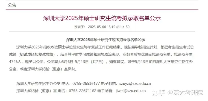 拟录取4746人!25考研深大硕士研究生统考拟录取名单公布 ...