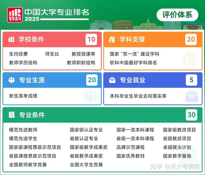 今日,高等教育专业评价机构软科今日正式发布“2025软科中国大学专业排名”,排名包括836个专业,涉及93个专业类、12个专业门类。软科中国大学专业排名是迄今为止覆盖专业数量最多、参评专业规模最大的中国大学本科专业排名。  软科中国大学专业排名设计了独具特色的专业竞争力评价框架,通过学校——学科——专业三个层次的评价汇总形成对专业的综合评价。排名指标体系设置学校条件、学科支撑、专业生源、专业就业、专业条件5个指标类别,共27项测量指标。  软科中国大学专业排名以全国排名前2%或前2名作为A+专业的标准。得益于学校强劲的综合实力,“双一流”高校在A+专业数上占据主导性优势,130所“双一流”高校的A+专业数占全国A+专业总数的比例超过80%。